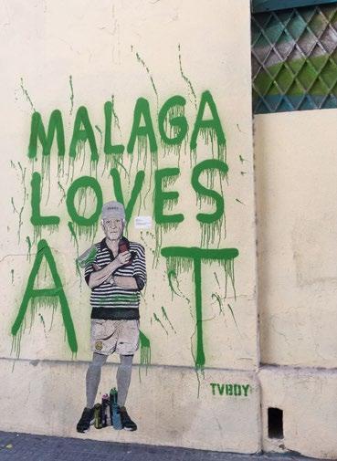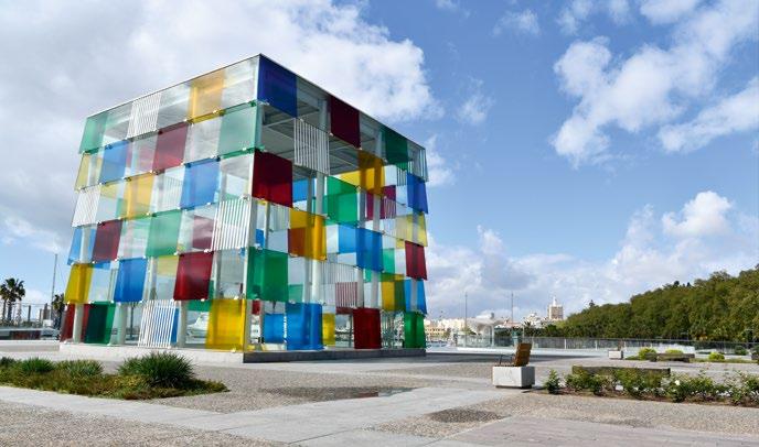VON Matthias EhlertOben: Huldigung an Picasso im Hafenviertel Soho vom Street-ArtKünstler TVBoy, li. der farbige Würfel des Centre Pompidou Málaga. Li. Seite die palmengesäumte Einkaufsmeile Puerta del Mar