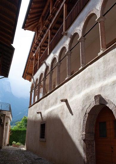 An der Fassade fallen die Rundbögen der Loggia aus rosafarbenem Stein ins Auge. Ein elegantes Detail, dass man eher an einem Palazzo erwartet als in einem Bergdorf. Der verwendete Stein, Ammonitico Rosso, wird seit der Römerzeit nördlich von Trento abgebaut. Sieht man ihn sich genauer an, entdeckt man spiralig aufgerollte Ammoniten, erstarrt im versteinerten Urschlamm, die von der geologischen Entstehungsgeschichte der Dolomiten künden. Denn ganz früher, vor 240 Millionen Jahren, gab es hier ein tropisches Meer, in dem riesige Korallenriffe, die heutigen Bergmassive, wuchsen.