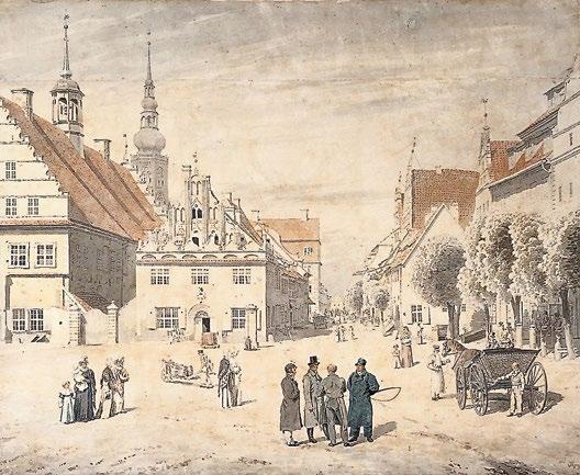 Im Geburtshaus des Malers (oben rechts) befindet sich heute das CasparDavidFriedrichZentrum. Das Aquarell vom „Greifswalder Markt“ (oben) schuf Friedrich 1818, es wird im Pommerschen Landesmuseum ausgestellt.