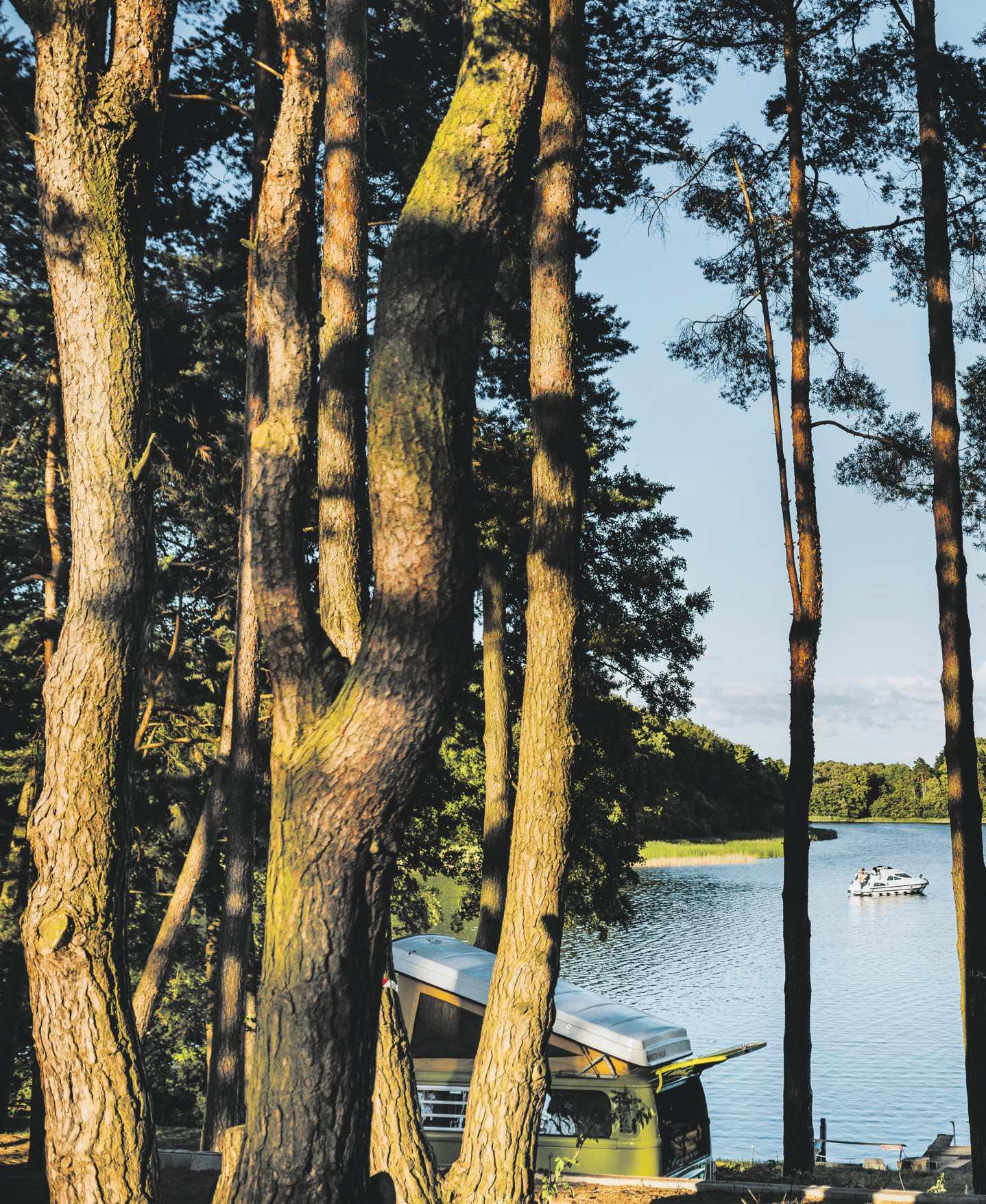 Auch das Abendessen wird nach Möglichkeit im Freien eingenommen, und bevor der blaue Pieper vom Bistro signalisiert, dass die Bestellung fertig ist, wollen alle noch schnell eine Runde toben. Das Essen – Pizza, Pommes oder Kartoffelsuppe mit Würstchen – ist deutlich über Imbissdurchschnitt. Ich entscheide mich für einen Klassiker mit eigenem Dreh: Fritten mit Chili con Carne. Dazu wird Grauburgunder empfohlen. Und am nächsten Tag gibt es Fritten mit indischem Curry. Kindergeburtstagsgefühl zum Sommerende. Stillsitzen und lesen, das schaffe ich das ganze Wochenende über nicht lange. Dieses Camperding ist ansteckend. Ich überlege, wie warm wohl das Wasser des Sees noch ist (warm genug), ob ich zuerst nach einem Kanu frage oder nachsehe, ob es den ominösen Zilpzalp-Wanderweg wirklich gibt, von dem ich gelesen habe. Wahrscheinlich hätte ich auch ein Holzhack- oder Löffelschnitzseminar gebucht, wenn es hier solche Kurse gäbe. Vielleicht liegt es am rauschenden Schwanken der Kiefern oder einfach nur an den ganzen Naturmaterialien, dass mir mein Tiny House nicht wie eine Klause aus Thoreaus Walden vorkommt, sondern wie ein Eichhörnchenkobel de luxe (welches Eichhorn hat schon Heizung, Kühlschrank und Kochplatte). Jedenfalls ist das in Canow schnell meine Gemütslage: bright-eyed and bushy-tailed, eine Wendung, die das Quietschfidele genau diesem Tier zuordnet und eine herrliche Neigung zu Unfug, Betriebsamkeit und Erlebnishunger beschreibt. Schon will ich wieder ins Freie.