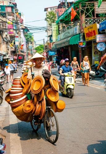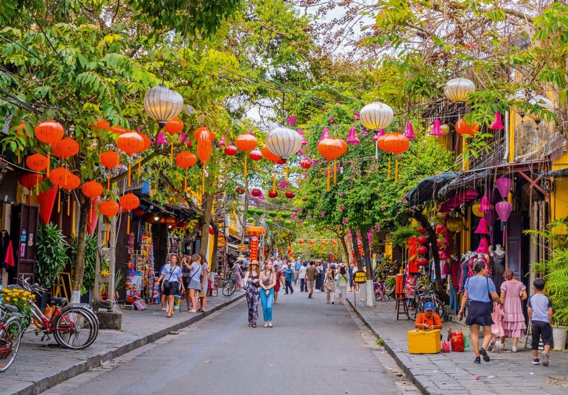 Wer in das Alltagseben der Menschen eintauchen möchte, sollte auf die Märkte gehen, die schwimmenden im MekongDelta, die quirligen in den großen Städten oder die beschaulichen auf den Dörfern. Menschen wie Bian und ihre Freundinnen mit ihrem Lächeln, den offenen Herzen und der Fröhlichkeit machen eine Reise durch Vietnam unvergesslich. Wobei das Land mit der reichen Kultur und der malerischen Natur sowieso schon voller Höhepunkte steckt. Einen davon erleben wir in Hoi An, das an der alten Seidenstraße liegt und zum Weltkulturerbe zählt. Teakhäuser, Tempel, kleine Teestuben und unzählige bunte Lampions, die an Häuserfassaden, auf Balkonen, Brücken und Booten baumeln, verzaubern das Städtchen. Am Abend spiegelt sich das Flackern der Laternen im nachtschwarzen Wasser des Thu Bon Rivers. Pärchen schlendern durch die engen Gassen, kleine Weinbars laden zum Aperitif ein. Wahrzeichen der Stadt ist die trutzige „Japanische Brücke“, die einst das chinesische und das japanische Viertel verband. Im Inneren entdeckt man einen Schrein, umhüllt von den Schwaden der Räucherstäbchen und von gelben Lampions umrahmt.