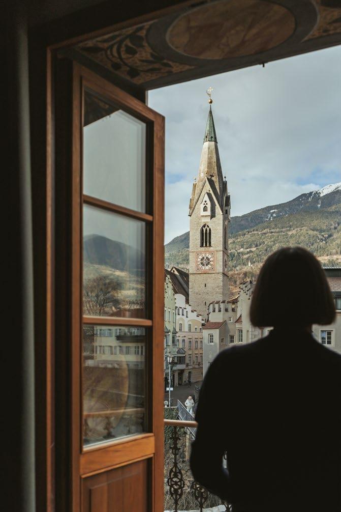 Schwer fällt uns der Abschied von diesem schönen Ort, aber wir müssen weiter nach Brixen. In der ehemaligen Bischofsstadt mit ihrer großen mittelalterlichen Tradition, die in Südtirol stets ein wenig im Schatten von Bozen und Meran steht, hat sich architektonisch einiges getan. Unser erster Anlaufpunkt ist das Lasserhaus, eines der ältesten und repräsentativsten Häuser der Stadt, geschmückt mit bunter Fassadenmalerei. 1642 direkt am Ufer der Eisack erbaut, bildet es eine Art Eingang zum Stufels, dem historischen Zentrum der Stadt. Aus dem früheren Adelssitz ist nun ein Art Hotel geworden, und was für eins! Nur selten erlebt man eine so geschickt austarierte Balance von Alt und Neu. Schon beim Betreten des Hauses fühlt man sich in eine andere Epoche versetzt. Das Kreuzgewölbe der Lobby, in der ein alter Prachtschlitten überrascht, strahlt eine historische Aura aus und wirkt zugleich aufgeräumt und modern. Dieser Eindruck setzt sich fort in den zehn Zimmern und Suiten, deren zeitlose italienische Eleganz auf dem Einsatz natürlicher Materialien wie Holz und Messing, aber auch von behaglichem Samt beruht. Einen frischen Kontrast dazu bilden die überall im Haus verstreuten künstlerischen Interventionen. Wer etwa im Erdgeschoss beim Herumstöbern – und das macht man in diesem labyrinthischen Haus gern – auf den Verkos-