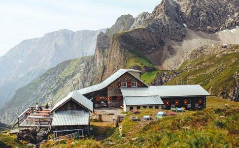 Gastlichkeit auf über 2000 Metern: Oben das Württemberger Haus in den Lechtaler Alpen, rechts Blick in die offene Küche der Gampe Thaya, unten Wanderer im Gaistal am Wetterstein