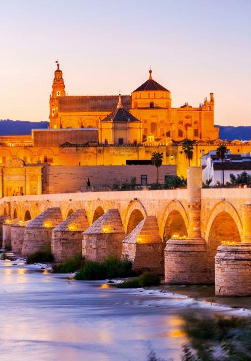 Mit 16 mächtigen Steinbögen führt die Römische Brücke in Córdoba über den Guadalquivir in die Altstadt mit der Mezquita, einer der größten ehemaligen Moscheen weltweit