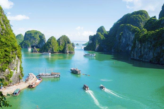 Hmong, die Roten Dao oder die Tay zu Hause, die mit ihren bunten Gewändern Farbtupfen wie bunte Blumen in die grüne Landschaft setzen. Das absolute Natur-Highlight Vietnams ist aber die Halong-Bucht. Ein Drache, heißt es, stieg einst ins Tal herab, schlug wütend mit dem Schwanz und spaltete die Berge. Zurück blieb die märchenhaft schöne Bucht mit den grün überwucherten Kegelbergen und dem smaragdfarbenen Wasser, auf dem Ausflugsboote unterwegs sind.
