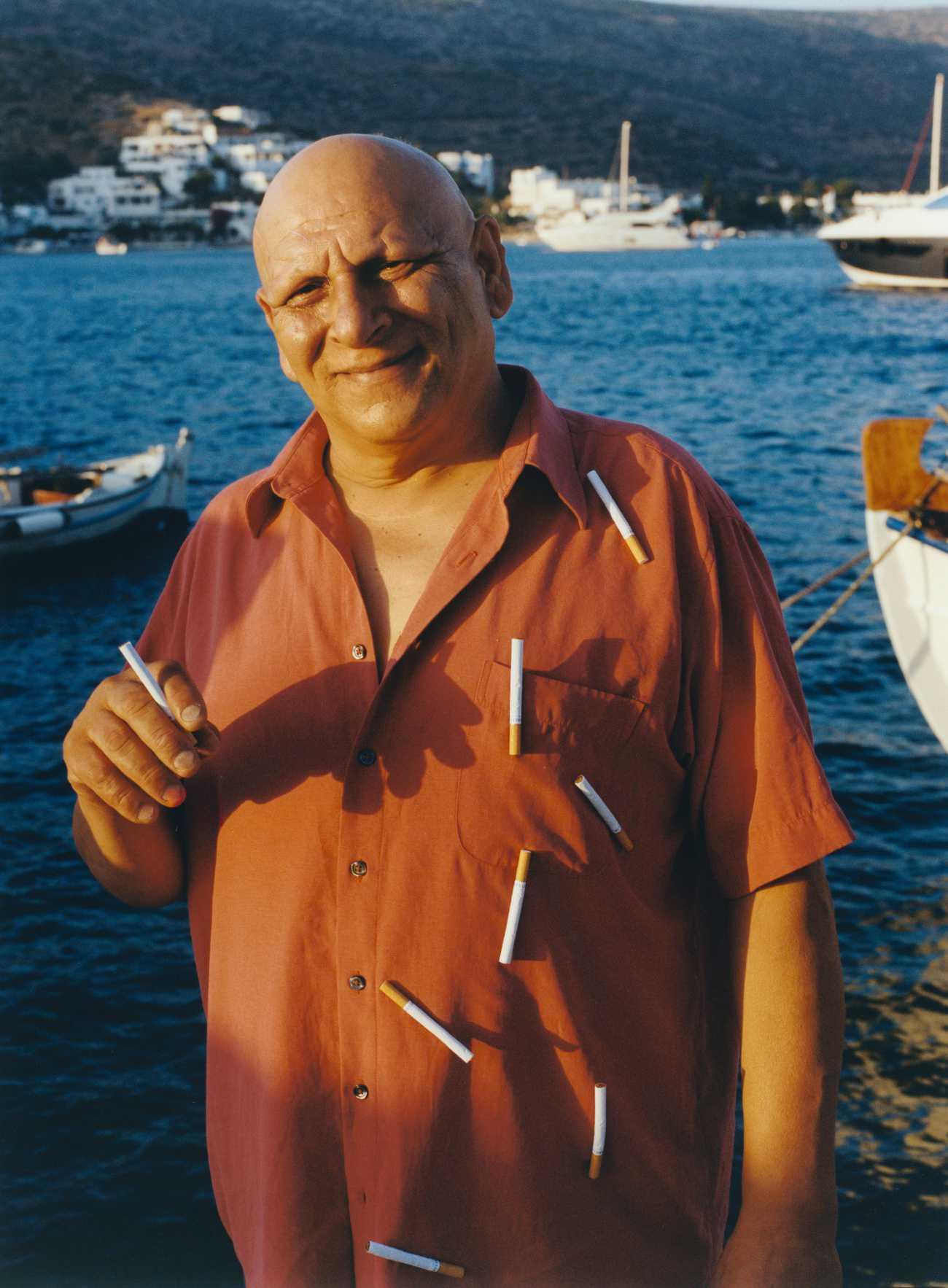 griechenland Ich traf Kostas in seinem Kiosk am Hafen von Amorgos. Er kümmert sich um seine Kunden, als wären sie Familienmitglieder bei ihrem jährlichen Besuch auf dieser abgelegenen Insel. Kostas hatte vor Kurzem mit dem Rauchen aufgehört, und wir feierten seinen Entschluss, indem wir ihm dieses Zigarettenhemd schenkten