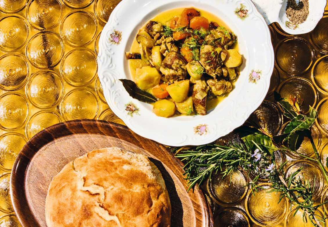 Fleisch aus dem Topf nehmen, die Fleischbrühe durch ein feines Sieb abgießen. In den Topf wieder etwas Olivenöl geben, darin das klein geschnittene Gemüse andünsten, also Knoblauch, Schalotten, Möhre, Kartoffeln. Etwas Farbe annehmen lassen, dann die Brühe dazugeben sowie das Fleisch. 20 bis 25 Minuten lang köcheln lassen, bis das Gemüse gar ist. Das Eigelb mit Zitronensaft verquirlen, 2 EL von der heißen Fleischbrühe hineinrühren. Diese Mischung in den Topf geben, sodass die Soße gebunden wird. Mit etwas fein gehacktem Dill servieren.