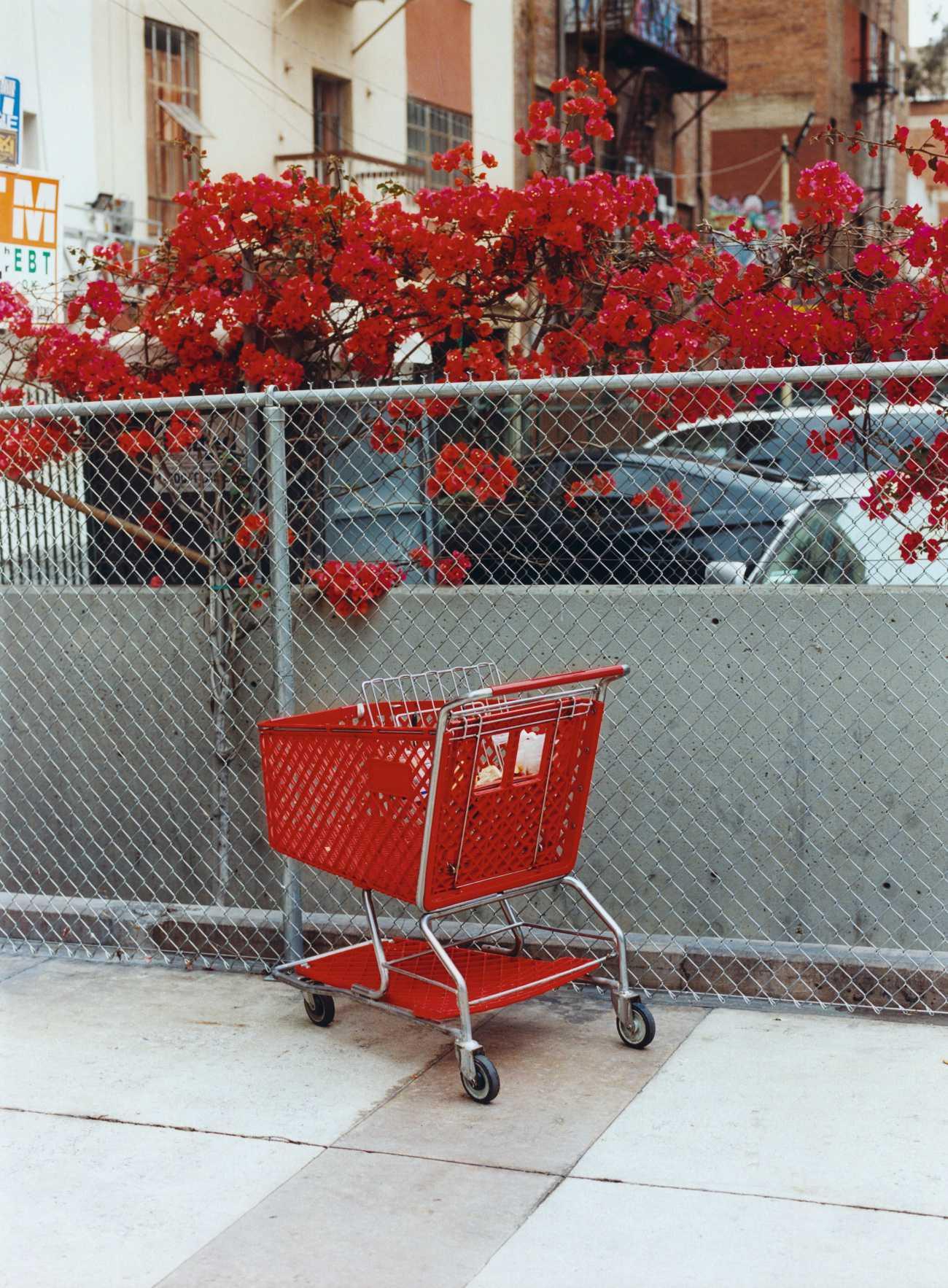 usa Eine Begegnung zwischen einem roten Einkaufswagen und den ikonischen roten Blumen, die überall in Los Angeles herumwuchern