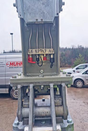 Die Hydronic-M-4000-K verfügt zudem über eine Fahrerkabine, die punktgenaues Anfahren und Aufnehmen von Rechengut ermöglicht. Konkret ist die Maschine in der Lage, den Rechen auf eine Tiefe von 17,7 m zu reinigen, wobei die Leistungskapazität mit 40 kN angegeben wird. In der Praxis konnte die RRM bereits zeigen, dass sie die beiden jeweils 6,5 m breiten Rechenfelder problemlos und nahezu übergangslos reinigen konnte. Was die Maschine aber besonders macht, ist das neuartige Schnellwechselsystem, das einen raschen Austausch zwischen Harke und Mehrschalengreifer ermöglicht. Der Schnellwechsler wurde dabei von Muhr so konzipiert, dass es nur wenige Arbeitsschritte und nur eine Person benötigt, um den Wechsel des Werkzeugs zu bewerk-