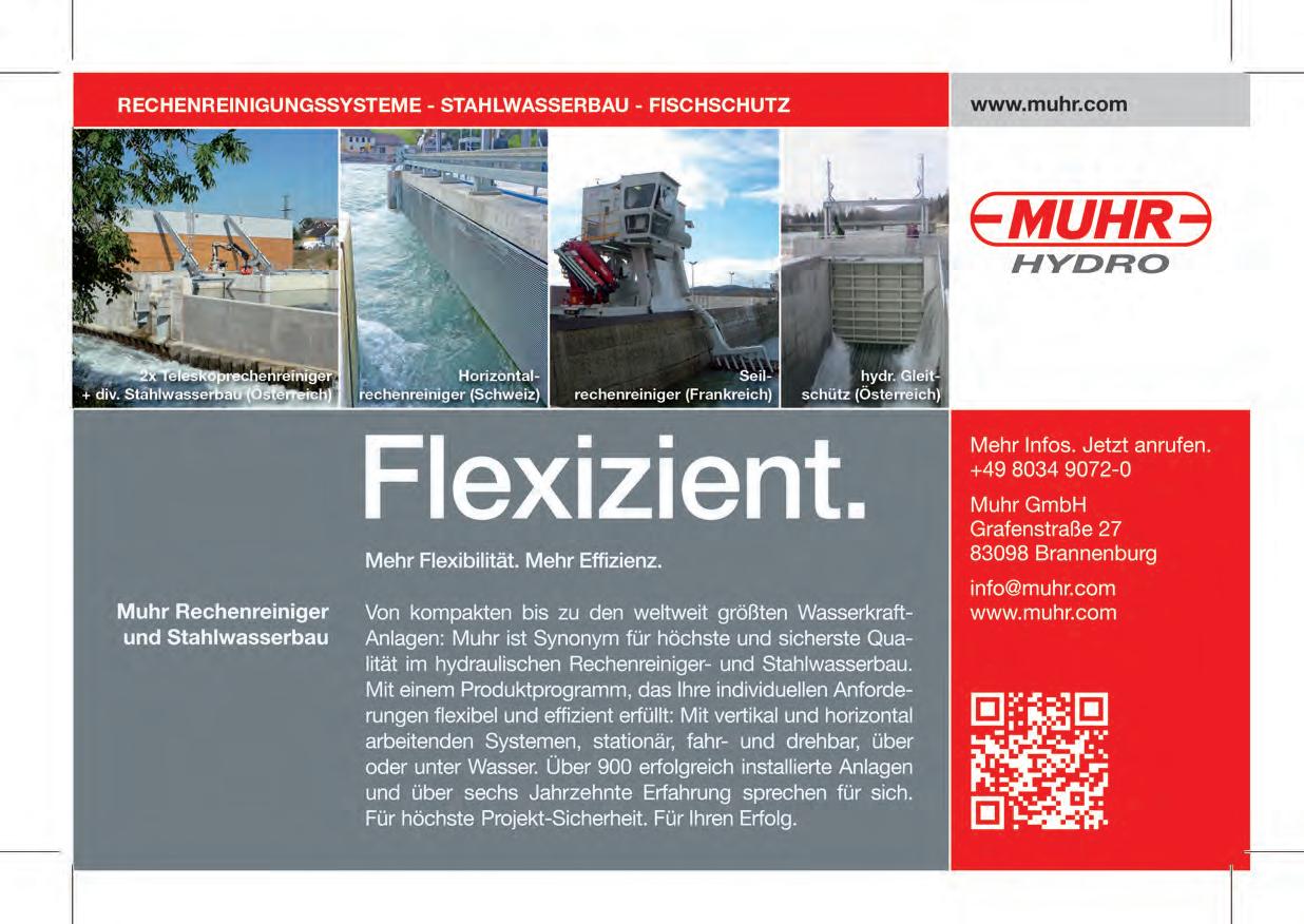 am internationalen Wasserkraftmarkt gehört, ist das Familienunternehmen Muhr aus dem bayerischen Brannenburg. Die lange Erfahrung und das Wissen um das Zusammenspiel von Wasserkraft und mechanischer Verfahrenstechnik liegen in den Wurzeln des Unternehmens begründet, das ursprünglich aus dem Mühlenbau kommt. Mit diesem Hintergrund ist es dem Unternehmen gelungen, stetig neue Lösungen für den Stahlwasserbau und natürlich für Rechenreinigungssysteme und Treibgutmanagement zu entwickeln.