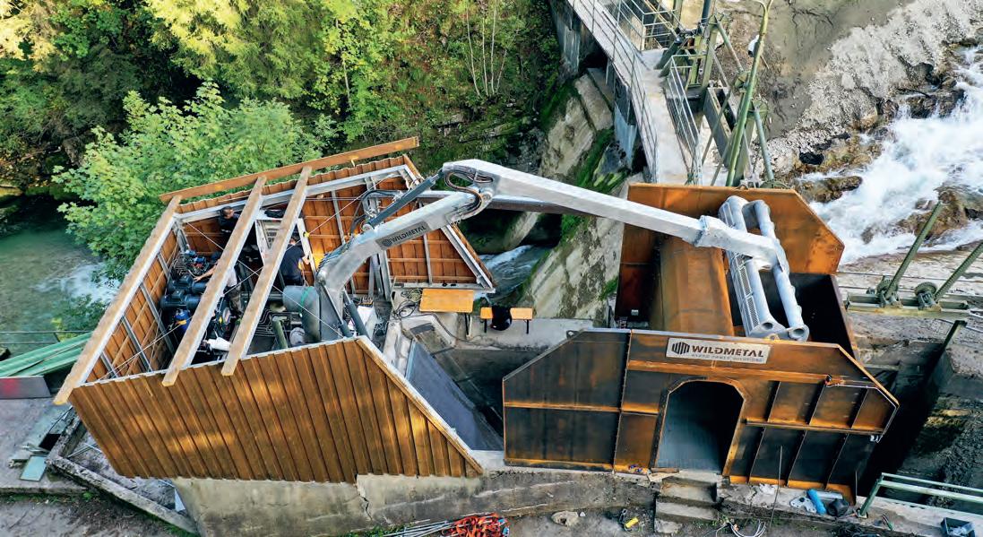 Eines der jüngsten Referenzprojekte im Bereich der Knickarmrechenreinigungstechnik hat Wild Metal für das Elektrizitätswerk Schattwald im Nordosten von Tirol umgesetzt. Im Zuge einer großangelegten Revitalisierung wurde die alte Rechenreinigungsanlage bei der Wasserfassung des Speicherkraftwerks Vilshofen im Vorjahr durch einen modernen Knickarmrechenreiniger mit ölhydraulischem Antrieb ersetzt. Die Maschine wurde von den Südtirolern mit einer Greifharke und sämtlichen Sensoren für die Auslösung des vollautomatischen Reinigungszyklus bestückt. „Das beschränkte Platzangebot an der Wasserfassung erforderte eine präzise Planung und Umsetzung, um den Knickarmreiniger samt Rechencontainer optimal zu integrieren. Dank einer kundenspezifischen, innovativen Lösung konnte dieses Problem jedoch erfolgreich gelöst werden“, so Daniel Polig: „Besonders herausfordernd war die bestehende Situation mit dem Einlaufrechen und dem darüber liegendem Betriebsgebäude, an dem die Dachstruktur abgebaut und erneuert werden musste, um Platz für den Knickarm der Maschine zu schaffen.“ Diese Randbedingungen erforderten eine Sonderlösung zur Handhabung des vom Schutzrechen entfernten Treibguts. Um den Anforderungen gerecht zu werden, konzipierte Wild Metal einen speziellen Rechengutcontainer mit einer integrierten Fußgängerbrücke, der von einer aus Cortenstahl gefertigten Haubenkonstruktion geschützt