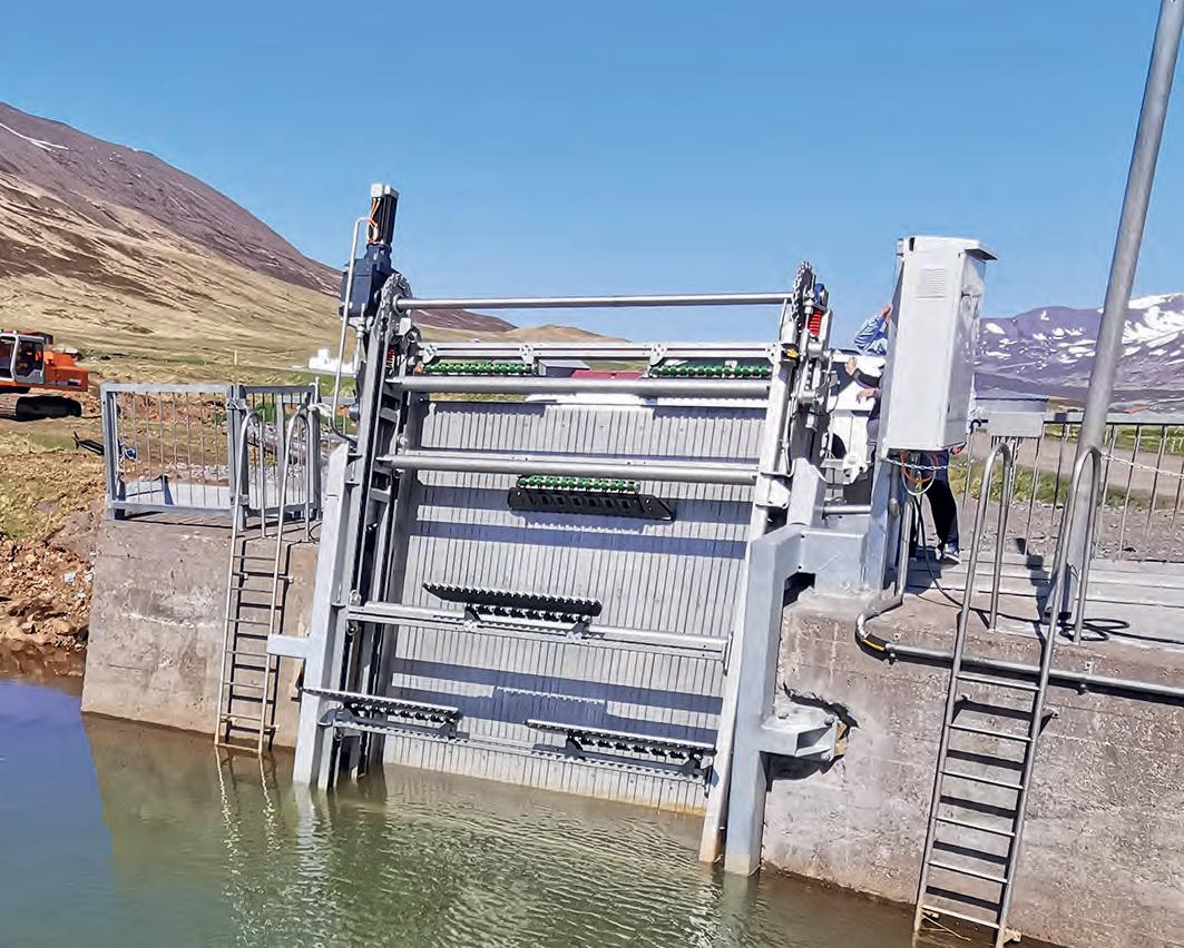 Der Clou des Systems besteht in einem weiteren Rechen im Untergrund des Wehrkörpers, der beim Reinigungsvorgang von unten in die Öffnungen zwischen die Profilstäbe geschoben wird – und dort quasi hineinpasst wie der Schlüssel ins Schloss. Mittels eines Hydraulikzylinders wird der bewegliche Rechenarm im Drehpunkt nach oben gedrückt. Auf diese Weise wird sämtliches Kleinmaterial und Geschwemmsel, das sich am Rechen oder zwischen den Stäben angesammelt hat, an die Oberfläche befördert und von dort weggeschwemmt. Nach wie vor handelt es sich dabei um keine alltägliche Lösung, dafür aber um eine ausgesprochen alltagstaugliche für Wasserfassungen, die starkem Geschiebedrang ausgesetzt sind.