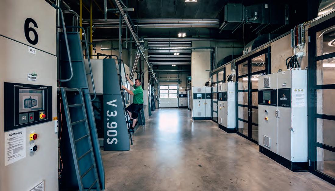 Zwölf Holzvergaser verstromen Pellets im größten Holzgas-Kraftwerk Österreichs. Gegenüber: die zugehörigen Blockheizkraftwerke. Seit ihrer Inbetriebnahme läuft die Anlage reibungslos. Das Betriebspersonal besteht aus drei hochmotivierten Fachkräften.