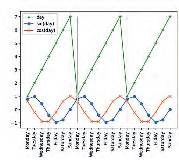 Die Rohdaten werden durch „Feature Engineering“ in einen effektiveren Satz von Eingaben umgewandelt, um etwa die Sprünge am Ende jeder Woche durch eine Projektion auf Sinus und Cosinus zu eliminieren.