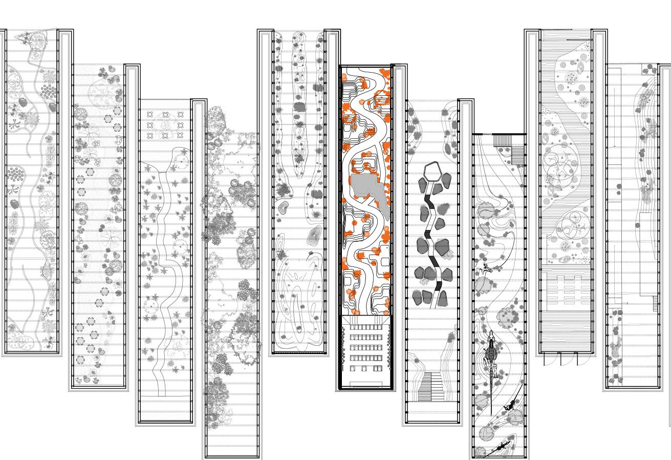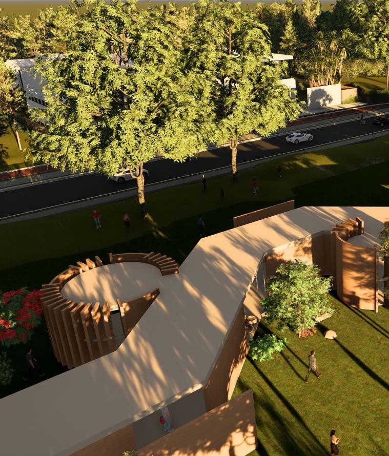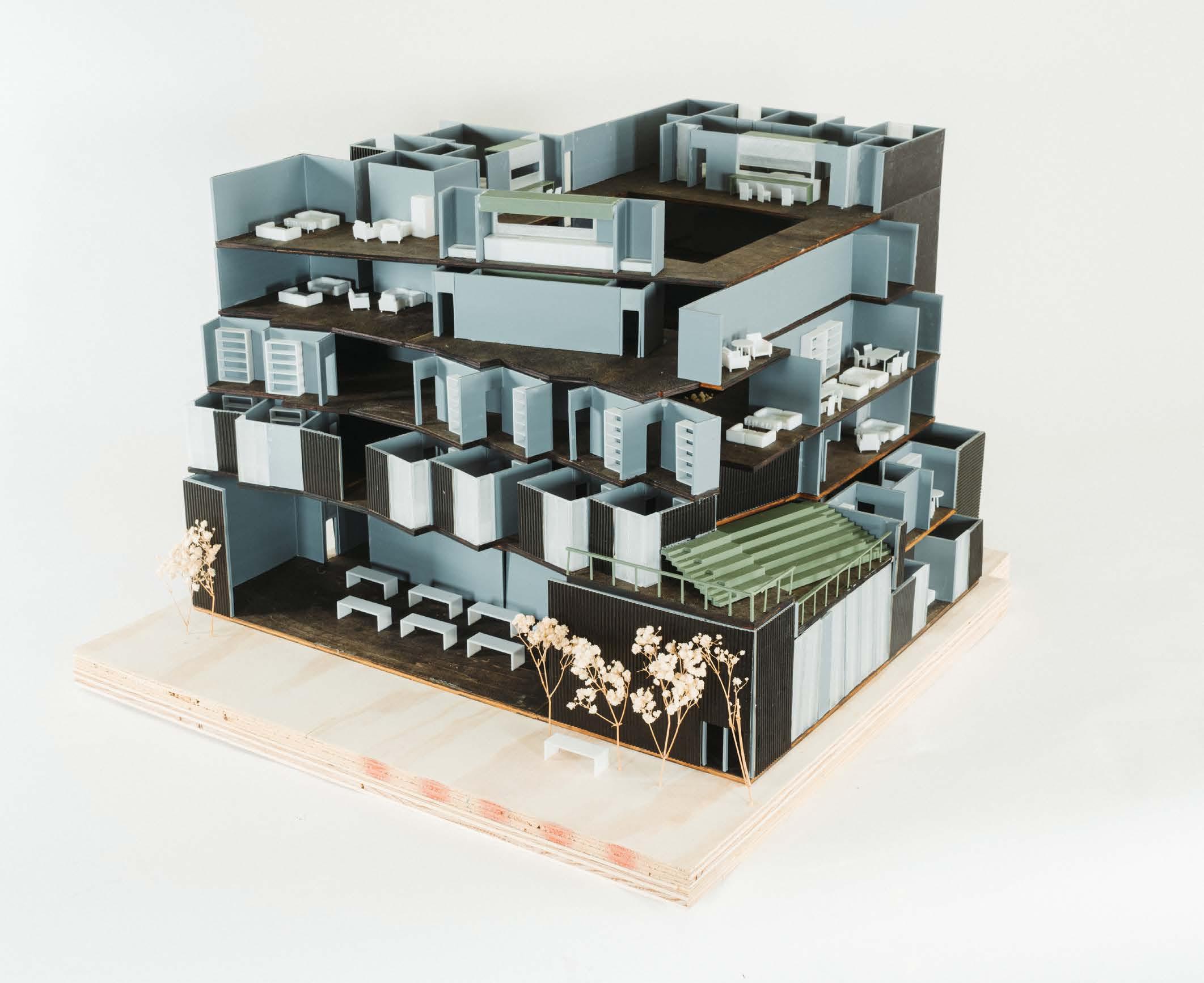 InterLAce is a dynamic co-living and co-housing community designed to combat gentrification by fostering local engagement and supporting small businesses. The ground floor features pop-up studios, providing flexible spaces for residents and entrepreneurs to activate the neighborhood with ever-changing creative and commercial opportunities. InterLAce prioritizes community interaction without sacrificing privacy, incorporating a unique "nosy neighbors" concept—bar-style seating along sliding windows allows residents to engage with neighbors and the courtyard while maintaining a comfortable level of separation. The design revolves around vibrant outdoor spaces, with communal areas like a coffee shop, library, gym, and gardens that serve as gathering points. A key aspect of the design is its site-specific approach to Boyle Heights, utilizing the adjacent sports center and park to reinforce the idea of community. The central units are carefully angled to maximize views, offering residents a direct connection to either the sports field or the city skyline. Additionally, stadium-like seating is integrated into the architecture, allowing residents to gather and watch games. By seamlessly blending private residences with public engagement zones, InterLAce reimagines urban living, ensuring a vibrant, inclusive, and ever-evolving environment that strengthens community bonds.