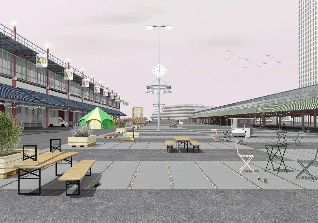 Der Produzentenmarkt, als Pergola in der Mitte des Engrosmarktes und des Stadions auf der gegenüberliegenden Seite, bietet eine riesige Dachstruktur für den Markt, indem er neue Markisenstrukturen hinzufügt, die einen neuen Charakter auf beiden Seiten des Platzes und der Stadt bringen. Die neu hinzugefügten Stützen dienen auch als Infrastruktur, um Strom und Beleuchtung für den Markt bereitzustellen. Auf der anderen Seite gibt es ebenfalls eine Reihe von Markisenstruktur für die darunter liegende Abladeplatz. Die neue Produktive Küche befndet sich auf der Dachterrasse und bildet ein Vis-à-vis zum Stadion mit einem perfomativen Charakter zum Platz und zur Stadt hin, und auf der anderen Seite gibt es Markisen für den Ladebereich der Küche, die das bestehende Gebäude gegenüber aufgreift. Die Mitte des Platzes wird teilweise abgeschnitten und durch geschnittenen und polierten Betonplatten aus dem Parkhaus ersetzt, um eine durchlässige Oberfäche zu schaffen, die das Regenwasser sammelt, das für die Blumenbeete auf der Kompostierungsseite verwendet wird. Die Farben, Lampe, Markise, Schilder, Pfasterung und andere Elemente schaffen eine festliche Atmosphäre und bietet eine echte Bühne um Lebensmittel zu zelebrieren.