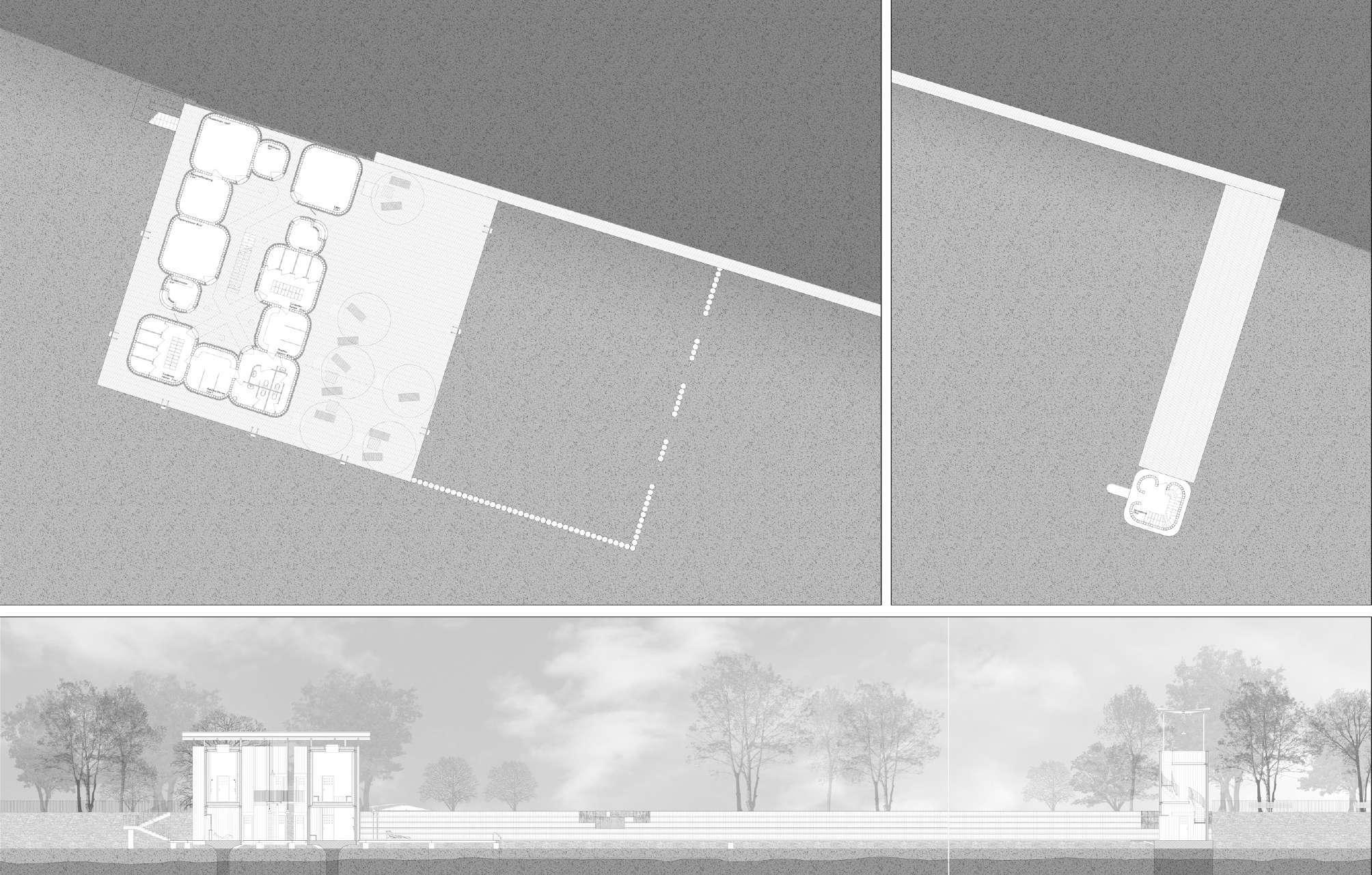 Das Hauptthema ist Gruppieren. Der Nichtschwimmerbereich setzt sich aus miteinander stehende Holzpfähle zusammen. Ebenfalls gruppiert sich das Gebäude aus miteinander funktionierte “Silos”, die gleichzeitig aus mitein- ander gedübelte Holzpfeilen besteht. Durch diese Art und Weise wird man sich an Flösse oder traditionelle durch Fluss transportierte fiessende Holz erinnert. Gegen aussen scheint das Gebäude geschlossen, man kann nur durch einige dunkele Fügen hineingehen. Aber wenn man an den Innere “Aussen ” gelangt, ist es eine ganz andere Welt, eine “Labyrinth ”,die mit Oberlicht und Klang vom Wasser erfüllt wird. Am Erdgeschoss befndet sich Gardroben und Duschenanlagen sowie WC und technische Räume mit dunkelen Atmosphäre wie eine leere Stamm und am Obergeschoss Sauna mit zentrale Oberlicht. Nicht nur durch Innenhof oder vom Dach aufhängende Brücke,sondern auch vom Körper zu Körper wird jede Raum erschliesst. Das Gebäude setzt sich aus zwölf Volumen mit unterschiedliche Masstäbe, klein, mittel und gross. Durch die Bewegung der 3 kleinen Körper nach Innen werden die Haupteingang betont. Die 3 Volumen werden gleichzeitig als Kiosk, Büromeister und Sanitärsraum benutzt. Durch die Variante der Grösse der Körper werden innere Türe an den Ecken gesetzt, durch welchem ist die Rundlichkeit mehr wahrnehmbar.