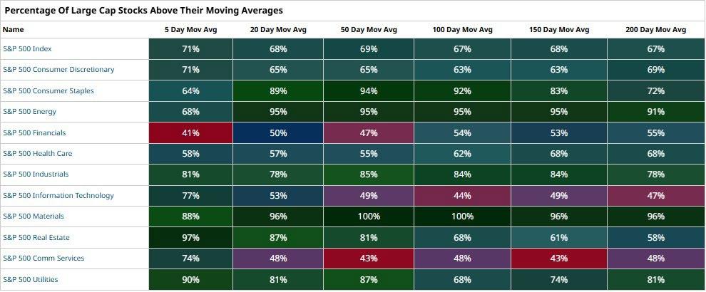 En la misma sección, abajo, encuentras una tabla que muestra el porcentaje de las empresas de alta capitalización del S&P 500, clasificadas por sector, que están por encima de las medias móviles de 5, 20, 50, 100, 150 y 200.