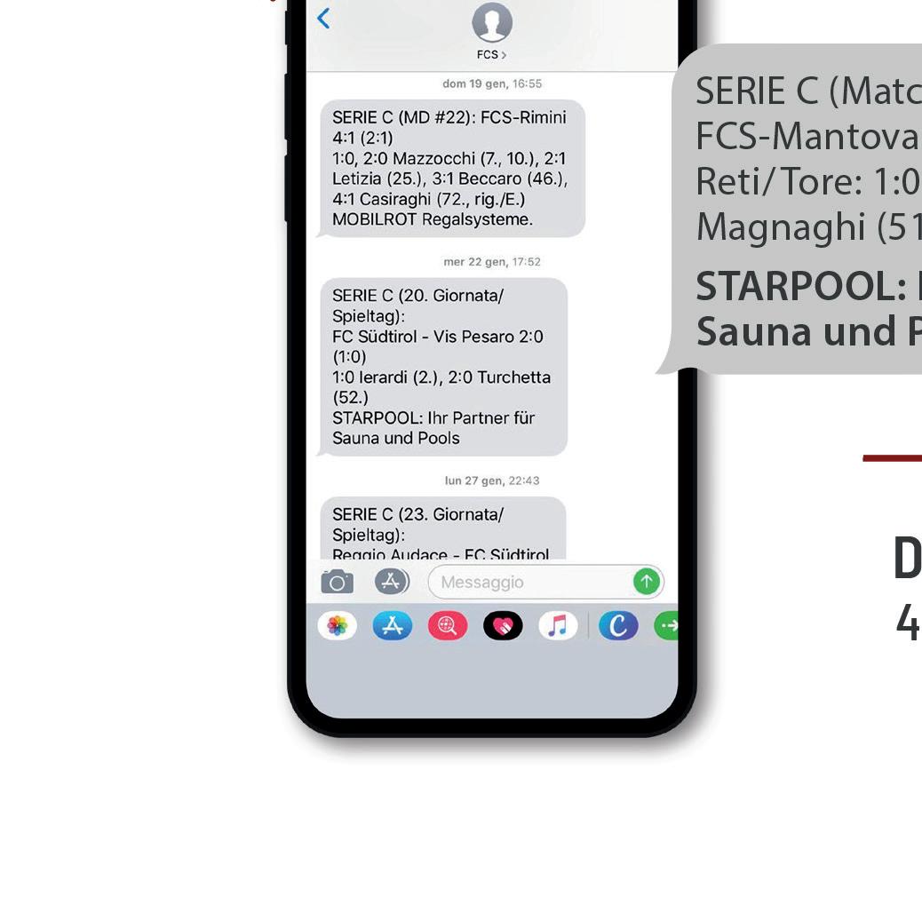 SMS con il risultato della partita viene inviato a tutti i soci dell‘FCS Südtirol e dell‘AFC Südtirol