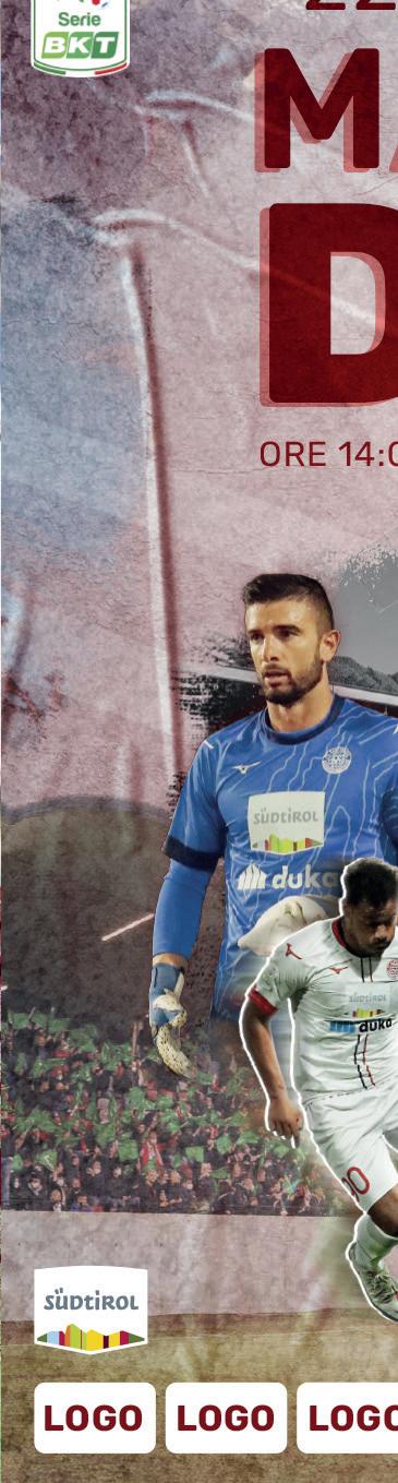 Tutti i prezzi inclusi nel catalogo pubblicitario sono esclusivi IVA. La progettazione grafi ca e i costi di produzione del materiale promozionale sono a carico del committente. Per ulteriori informazioni rivolgersi all‘FC Südtirol.