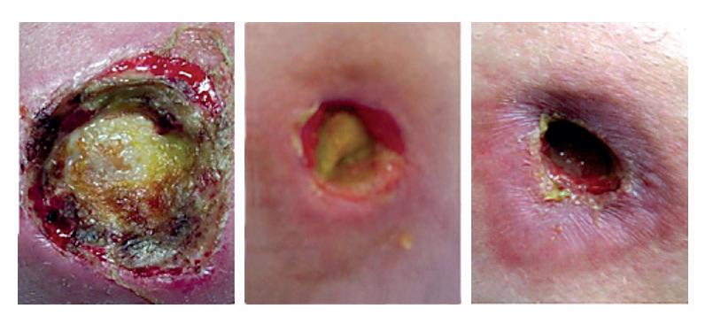Druckgeschwür dritten Grades im Bereich des Trochanter major (A). Nach 15 PhototherapieSitzungen wurde eine Verbesserung beobachtet (B). Signifikante Heilungsfortschritte wurden nach 30 Sitzungen mit der BIOPTRON® Hyperlight-Therapie erzielt (C).