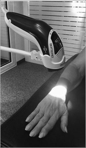ABioptronphototherapeuticdevice(BioptronAG,Wollerau,Switzerland)with5cmtreatmentdiameter(Bioptron MedAll;480–3400nm;polarizationlevel95%;powerdensity40mW/cm2;energydensity2.4J/cm2/min)wasusedfor irradiationofthedorsalhandregion,accordingtomanufacturer’srecommendations(Table1).Group2receivedBioptronlighttherapyforatotalof10minperdayonfivepoints ofthedorsalhandregion(2mineach)atadistanceof10cm foraperiodof15days(Fig.1).Bioptronlighttherapy,unlike laserlight,containspolychromaticlightinthevisibleandpart oftheinfraredrange(withoutultravioletradiation).Bioptron lighttherapyhasseveralbenefits,butforthecurrentpurpose, improvedmicrocirculation,vasomotorfunction,andanalgesiceffectsareofclinicalimportance(Fig.2).16–18