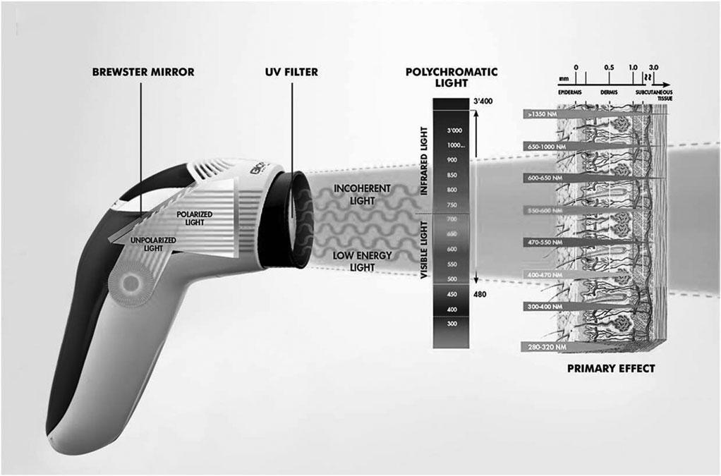 FIG.2. Schematicrepresentationofthelighttherapydevice(BioptronMedAll,BioptronAG,Wollerau,Switzerland). ThedeviceusedaBrewstermirrortocreatepolarizedlightoflow-energylevels.Thepolychromatic,incoherentwavelengths,excludingultravioletradiation,induceprimary,biostimulatoryeffectsontheskin.