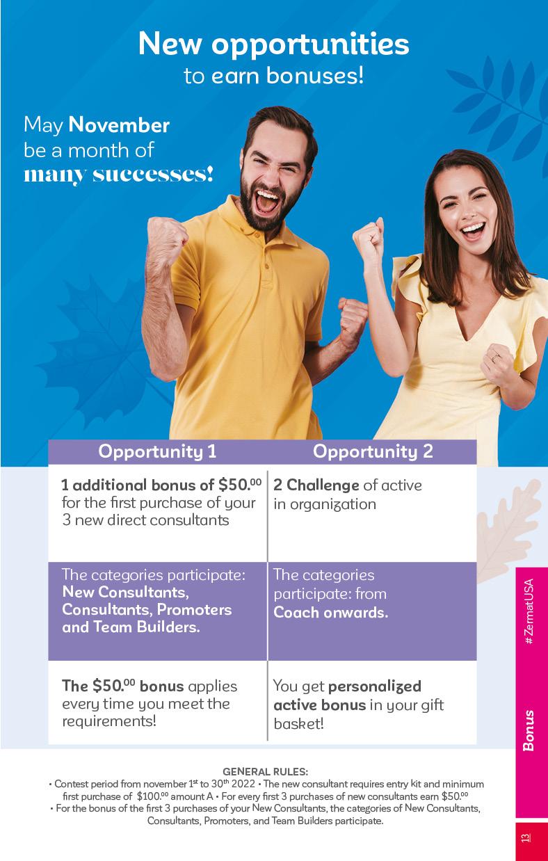 GENERAL RULES: • Contest period from november 1st to 30th 2022 • To make theCertified Promoterbonus valid, it requires the retention of equal or greater leadership rank during the months of december and january 2023. =$400.00 Get your nomination in november You Win $50.00 Keep it during december You Win $175.00 For january Others You Win $175.00 Requirements to qualify: $100.00 personal purchase Have at least 6 ACTIVE consultants For each Direct Certified Promoter, who is appointed for the first time, you and he or she receives $50.00 Make your leadership grow! Purchase volume of your whole organization of $2,250.00 12 #ZermatUSA Bonus Certified Promoter Nomination Bonus (first time) Become a Certified Promoter in NOVEMBER and get a TOTAL bonus of $400.00