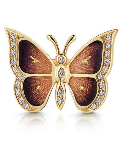 This alluring 18ct yellow gold Faberge butterfl y brooch boasts indulgent deep brown enamel wings adorned with scintillating diamonds that outline the edge of the wings. £2,727 berrysjewellers.co.uk