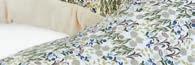 Bed: Sandö I Fabric: Designer´s Guild Rothesay Zinc I Carpet: Soft Greige I Bed Linen: Storm Shell I Bedside table: Holme I Headboard: Rivö I Bed legs: Reling MADE BESPOKE WITH FABRICS FROM AND
