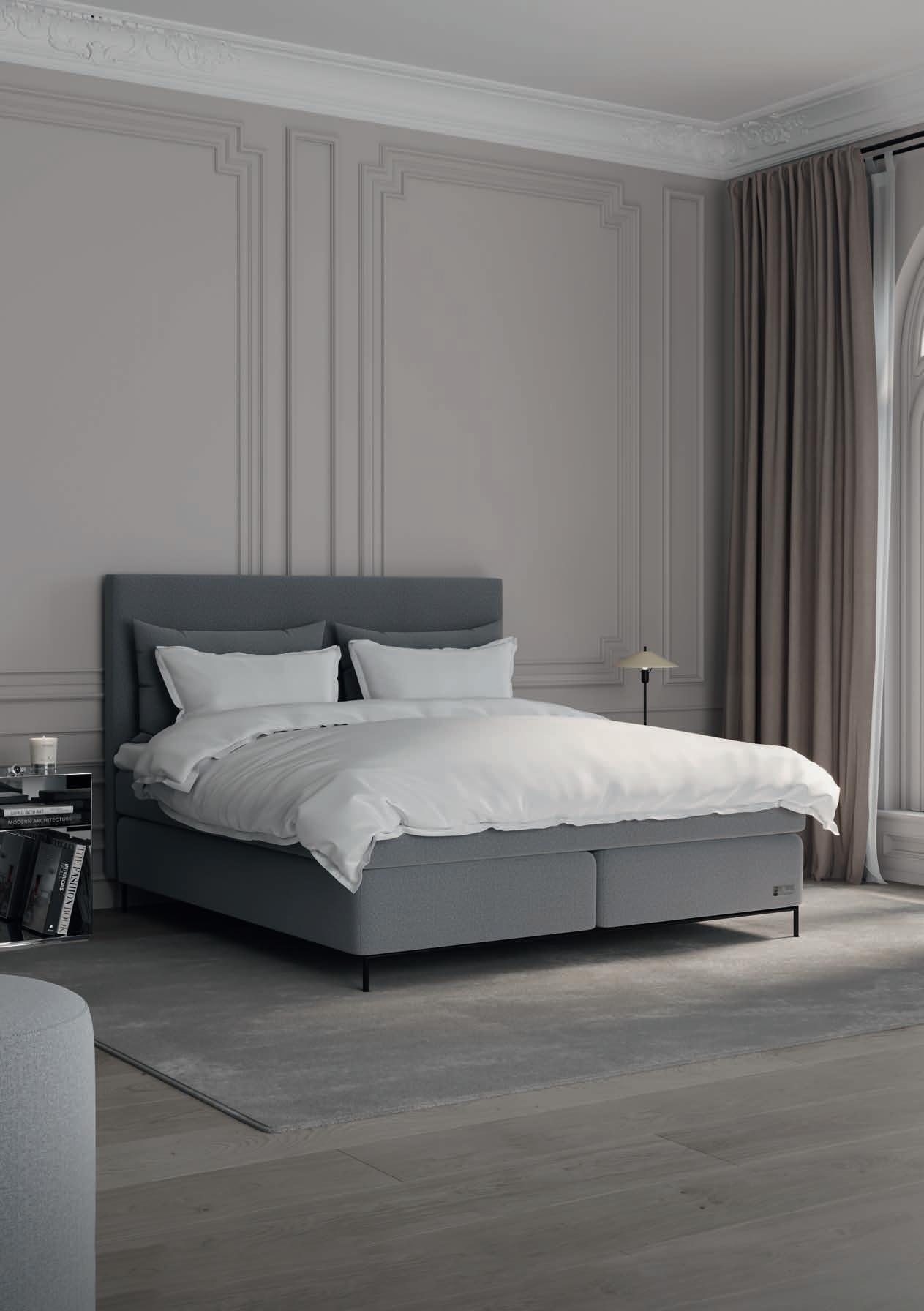 Bed: Sandö I Fabric: Designer´s Guild Rothesay Zinc I Carpet: Soft Greige I Bed Linen: Storm Shell I Bedside table: Holme I Headboard: Rivö I Bed legs: Reling MADE BESPOKE WITH FABRICS FROM AND