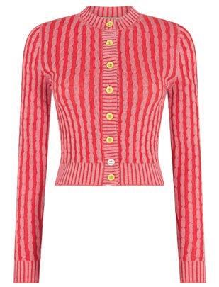 This red and pink cashmere cardigan by Cormio features ribbed detailing, a high round neck and flower buttons. £400 koibird.com