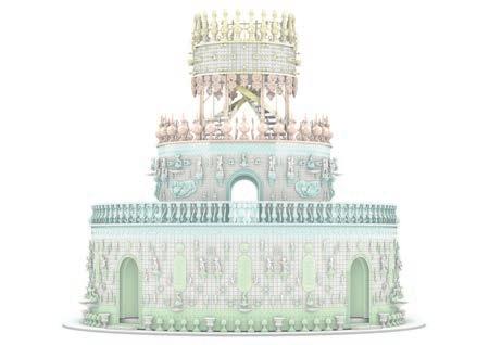 Almost five years in the making, Wedding Cake was commissioned by the Rothschild Foundation for Waddesdon, prompted by the relationship between visionary collector Lord Rothschild and Vasconcelos. Part sculpture, part architectural garden folly, Wedding Cake is an extraordinary, enormous fully immersive sculpture which combines patisserie and architecture. Gleaming and icing-like outside and in, it o ers an intricate and richly sensory experience.