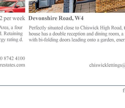 SALES £330 PER WEEK A newly decorated lower ground floor garden flat with private west facing garden. Large double bedroom with wardrobes, receptio n room with wood floors, bathroom with shower over, fitted kitchen, garden. The flat is on one of Chiswick's best located roads, moments from the shops, restaurants cafés on the High Road and 5 minutes from Turnham Green station. The property is available early September, furnish ed. LETTINGS 5-7 Turnham Green Terrace, Chiswick, London, W4 1RG Tel 020 8747 8800 · Fax 020 8995 7275 E-mail info@whitmanandco.com · Website www.whitmanandco.com An amazingly light, well presented triple aspect flat with the added benefit of a balcony and private garden. Three bedrooms, luxury bathroom, 14' reception room, fully integrated kitchen, gas fired central heating, share in the freehold, balcony and private garden with side access. Ideally situated within close proximity of Chiswick Park tube station and the extensive shopping and restaurant facilities on Chiswick ADDISON GROVE, W4 £5,000,000 HADLEY GARDENS, W4 £3,000,000 RUSTHALL AVENUE, W4 £2,500,000 ST MARY’S GROVE, W4 £3,250,000 FAIRFAX ROAD, W4 £2,750,000 PARK ROAD, W4 £2,750,000 WELLESLEY ROAD, W4 £2,750,000 HEATHFIELD TERRACE, W4 £2,250,000 BARROWGATE ROAD, W4 £2,250,000 SOLD IN 2022 SOLD SOLD SOLD SOLD SOLD SOLD SOLD SOLD SOLD