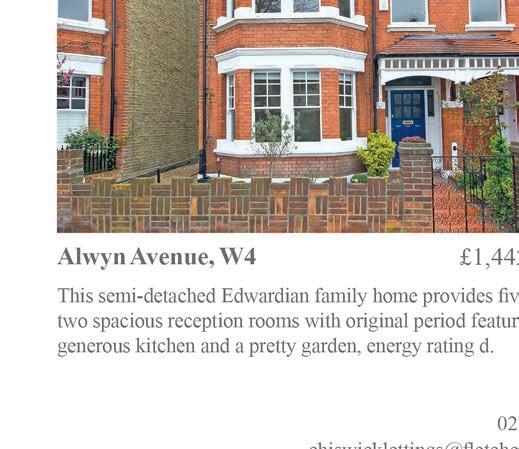 SALES £330 PER WEEK A newly decorated lower ground floor garden flat with private west facing garden. Large double bedroom with wardrobes, receptio n room with wood floors, bathroom with shower over, fitted kitchen, garden. The flat is on one of Chiswick's best located roads, moments from the shops, restaurants cafés on the High Road and 5 minutes from Turnham Green station. The property is available early September, furnish ed. LETTINGS 5-7 Turnham Green Terrace, Chiswick, London, W4 1RG Tel 020 8747 8800 · Fax 020 8995 7275 E-mail info@whitmanandco.com · Website www.whitmanandco.com An amazingly light, well presented triple aspect flat with the added benefit of a balcony and private garden. Three bedrooms, luxury bathroom, 14' reception room, fully integrated kitchen, gas fired central heating, share in the freehold, balcony and private garden with side access. Ideally situated within close proximity of Chiswick Park tube station and the extensive shopping and restaurant facilities on Chiswick ADDISON GROVE, W4 £5,000,000 HADLEY GARDENS, W4 £3,000,000 RUSTHALL AVENUE, W4 £2,500,000 ST MARY’S GROVE, W4 £3,250,000 FAIRFAX ROAD, W4 £2,750,000 PARK ROAD, W4 £2,750,000 WELLESLEY ROAD, W4 £2,750,000 HEATHFIELD TERRACE, W4 £2,250,000 BARROWGATE ROAD, W4 £2,250,000 SOLD IN 2022 SOLD SOLD SOLD SOLD SOLD SOLD SOLD SOLD SOLD