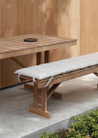 Børge Mogensen’s Outdoor series is characterized by its functional strength and timeless silhouettes. Developed in the 1970s, the series can be easily folded when not in use and is made from FSC®-certi ed teak wood, completing the classic Shaker-inspired style. | BM1771 Table, FSC™-certi ed teak, untreated, 194.5x78 cm, H72 cm, £1,309 | BM1871 Bench, FSC™-certi ed teak, untreated, £738 | CU BM1871 Cushion, Heritage Papyrus 18006, £236