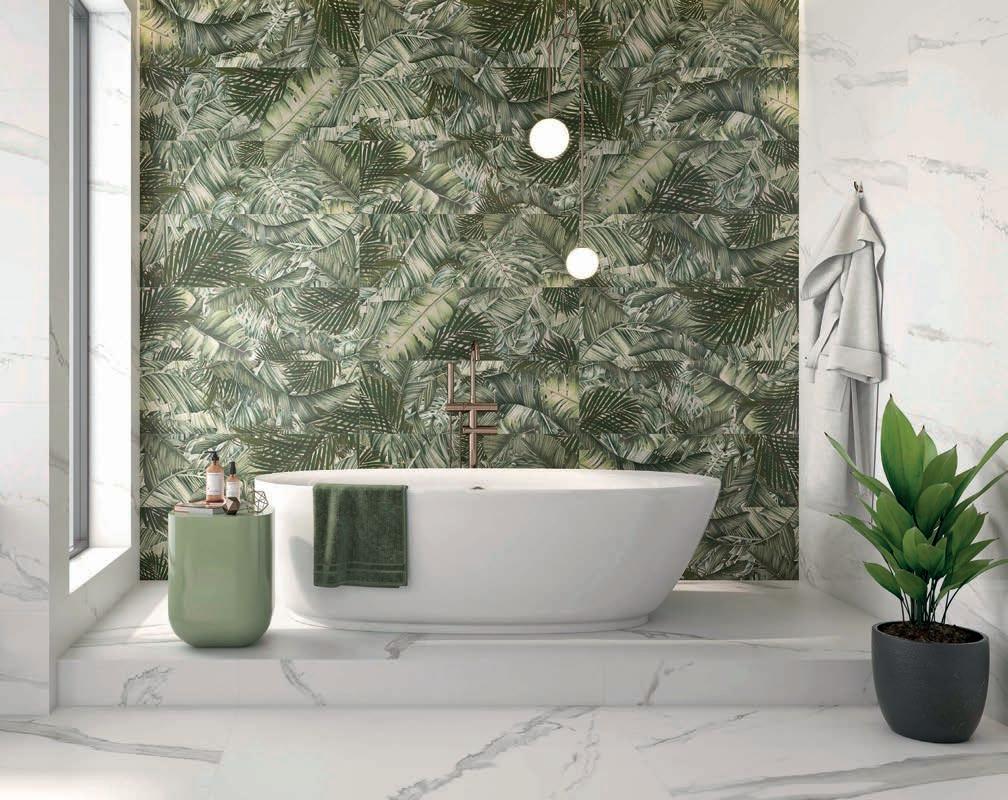Botanical Decor Tiles are perfect for creating a relaxing sanctuary inside your home with their bold, natural look. Large leaves dominate the surface of these tropical tiles in a mix of shapes and sizes, creating depth and texture. With a subtle matt finish, these large format tiles present fewer grout lines, alongside rectified edges for a smooth and seamless look. Available in 33 mm x 100mm wall tiles.