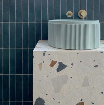 The stylish fluted design exterior of the Arezzo round countertop vessel basin will create a touch of finesse in any bathroom. This chic basin can be fitted to a vanity unit or shelf for a stunning focal point and is best complemented with a high rise basin mixer or wall mounted tap. Available in a variety of colours. Pictured with Norwich Petrol BlueWall tiles. Bespoke Washstand made Inhouse with Ravello Natural Terrazzo – these can be produced in most tiles.