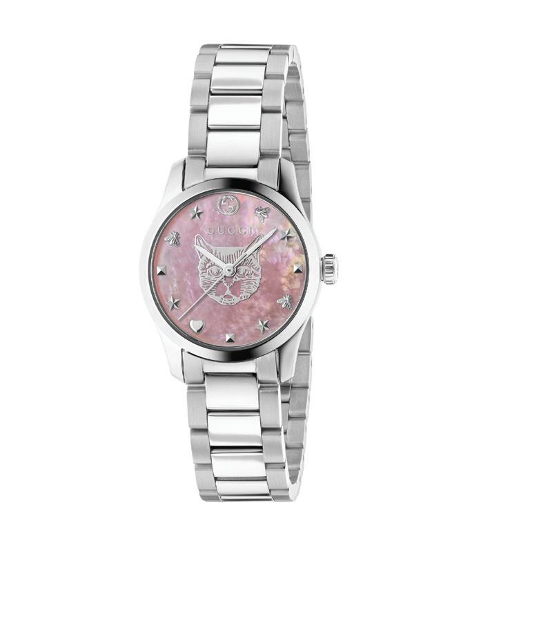 Gucci G-Timeless Mystic Cat is a 27mm watch with a pink motherof-pearl dial, water resistant to 50 metres and complemented with a steel bracelet that has contrasting brushed and polished fi nished links, £950. bakerbrothersdiamonds.com