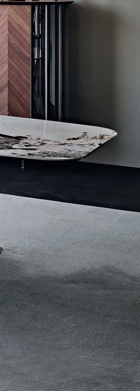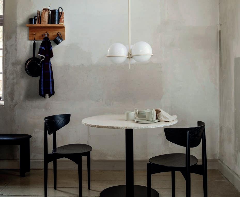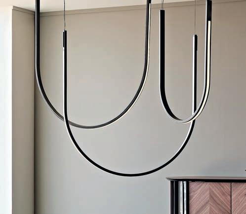 The Oneline pendant by artist Kasper Friis Kjeldgaard for Fritz Hansen is a sleek slash of brightness which rotates 360 degrees to cast light in any direction. “Creating something that appears simple is always the most complex,” says Kasper. At the other end of the linear spectrum is Cattelan Italia’s Nahun lamp by Studio Kronos, which seems almost typographical in its form. Its outer LED strip alight with an inconspicuous, di used glow ideal for a subtle dash of brightness. Lodes’s Elara pendant by Nika Zupanc is a pair of ultra-delicate rings, the loops silently interacting with and orbiting each other, while the Gravity Chandelier