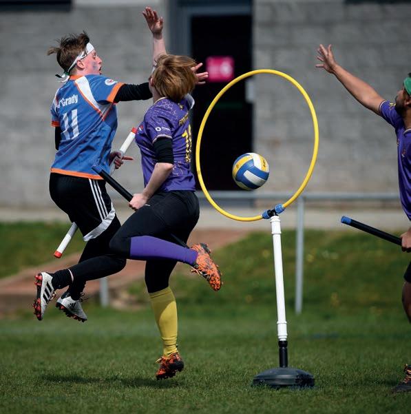 one of three opposition hoops. Each team defends their own hoops with tackles and bludgers (dodgeballs). The game ends when the winning team has a legal catch on the snitch (a neutral player, who enters play 15 minutes in wearing what is e ectively a tennis ball in a sock attached to the back of their shorts) or when one team has a 30-point lead. You can understand why students love it: fast, fun and a bit wacky – you play while holding what is e ectively a broom handle between your legs in homage to the fictional game.