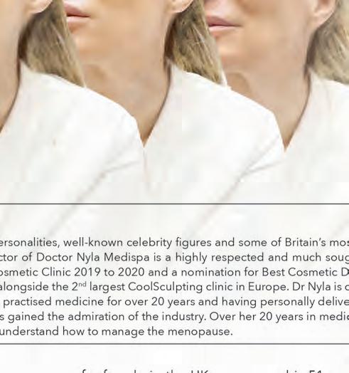 : Doctor Nyla is a skin specialist, trusted by TV personalities, well-known celebrity figures and some of Britain’s most familiar faces in the media industry. Founder and Medical Director of Doctor Nyla Medispa is a highly respected and much sought after cosmetic Dermatology GP. Dr Nyla is a winner of Best Cosmetic Clinic 2019 to 2020 and a nomination for Best Cosmetic Doctor 2021. With the largest Exilis Elite skin tightening in the UK, alongside the 2nd largest CoolSculpting clinic in Europe. Dr Nyla is considered one of the top cosmetic doctors in the country. Having practised medicine for over 20 years and having personally delivered over 200,000 treatments with truly exceptional results, she has gained the admiration of the industry. Over her 20 years in medical aesthetics, she has transcended across the years to personally understand how to manage the menopause.