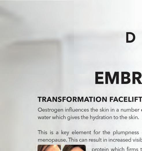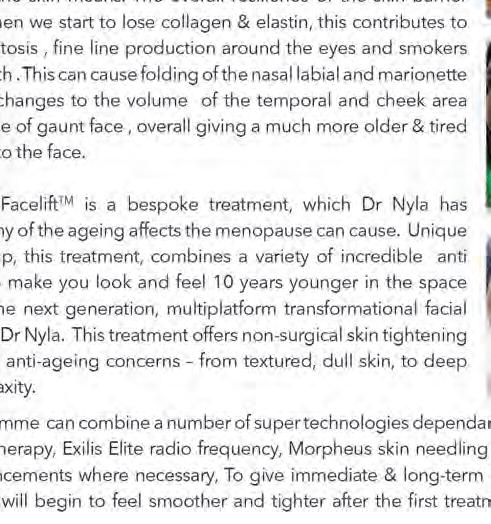 The Transformation FaceliftTM is a bespoke treatment, which Dr Nyla has designed to treat many of the ageing affects the menopause can cause. Unique to the medispa group, this treatment, combines a variety of incredible anti ageing treatments to make you look and feel 10 years younger in the space of only six weeks! The next generation, multiplatform transformational facial offered exclusively at Dr Nyla. This treatment offers non-surgical skin tightening and lifting to treat all anti-ageing concerns –from textured, dull skin, to deep wrinkles and loss of laxity.