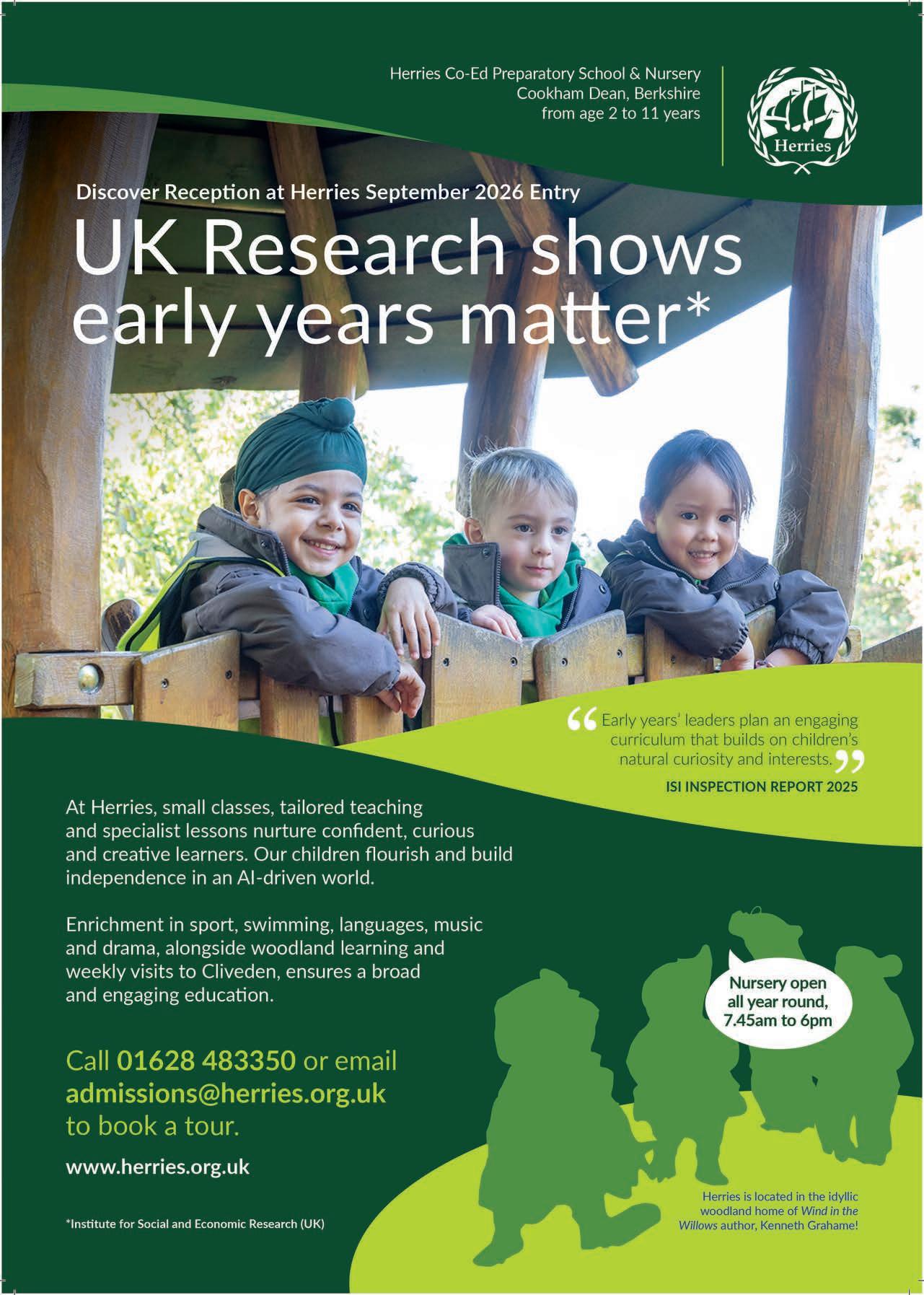 Nestled in Berkshire countryside, Herries is a highly sought-a er co-educational school for children aged 2-11. The Nursery offers both a 47.2-week and a 34-week model, providing families with flexibility to suit their needs. In March 2025, the Independent Schools Inspectorate (ISI) recognised Herries’ commitment to excellence in a strong report, describing the school as a family-focused community that delivers high academic standards, a varied curriculum, and an inclusive, nurturing environment, enriched by a wide range of extra-curricular opportunities. Small class sizes are pivotal to their success, enabling tailored teaching, individual attention and dedicated learning time. Through character education and a broad curriculum, pupils enjoy opportunities in public speaking, drama, music, art, sport and forest activities. Their commitment to sporting excellence was recognised in 2024, when Herries was shortlisted for the ISA Award for Outstanding Sport Provision in a Small School. They would be delighted to welcome you and show you around their fantastic school. herries.org.uk