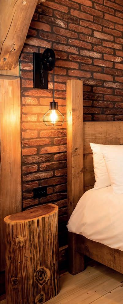 Every element of Swinney Wood has been designed with romance in mind. The cabins themselves, handcrafted from Western Red Cedar, feel both luxurious and grounded in nature. Step inside and youíre greeted by warm textures, soft lighting and the comforting glow of a log burner an immediate invitation to relax. The layout enhances the sense of escape. Open≠plan living spaces flow e ortlessly, while a whimsical staircase leads to a mezzanine level where a king≠size four≠ poster bed and freestanding bathtub create a truly indulgent retreat within a retreat. Bathrooms are equally considered, featuring double sinks and rainfall showers designed for two, reinforcing the focus on shared experiences. Every detail, from the materials to the layout, encourages guests to slow down and savour the moment.