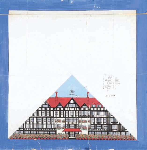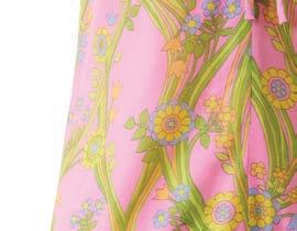 the brand. The exhibition opens by examining how Liberty embedded itself into everyday life: from its distinctive Tudorbethan flagship building to its role in both high-street fashion and bespoke couture. A 1975 scarf design by Susan Collier and Sarah Campbell cleverly echoes the architecture of the store itself, underscoring how deeply brand, building and design are intertwined.