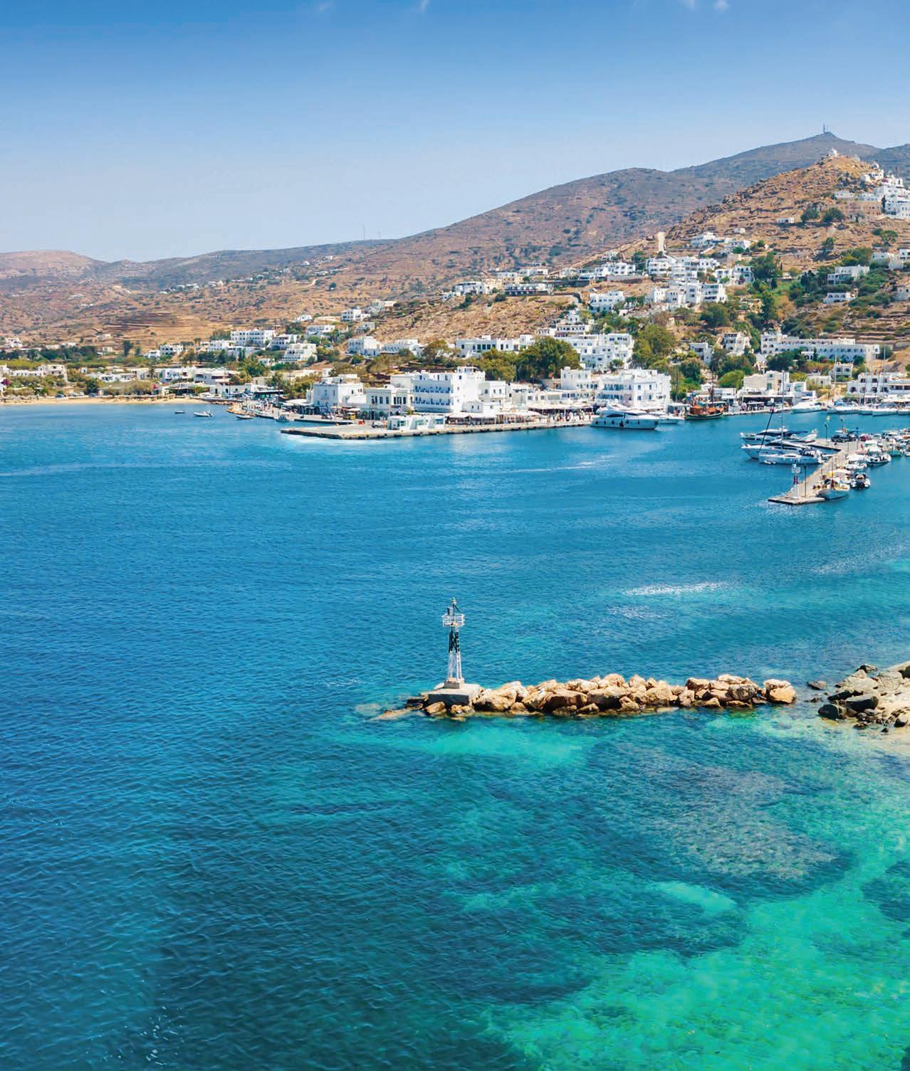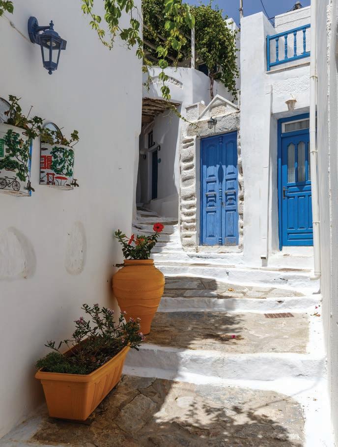 its spine, hairpin by hairpin, before spending time relaxing at a beach club in the gorgeous little town of Katapola. Boats bob lazily and the aroma of sage and thyme fills the air as we sip on local beer and swim in the crystal-clear sea. We wander the narrow streets in the sunshine, picking up local olive oil, herbs and zesty citron liqueur, the island’s signature tipple.