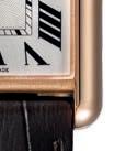 The Cartier Tank Louis Cartier 18ct Rose Gold Large Model Leather Strap Watch has a silvered dial with black roman numerals and blue steel hands. berrysjewellers.co.uk