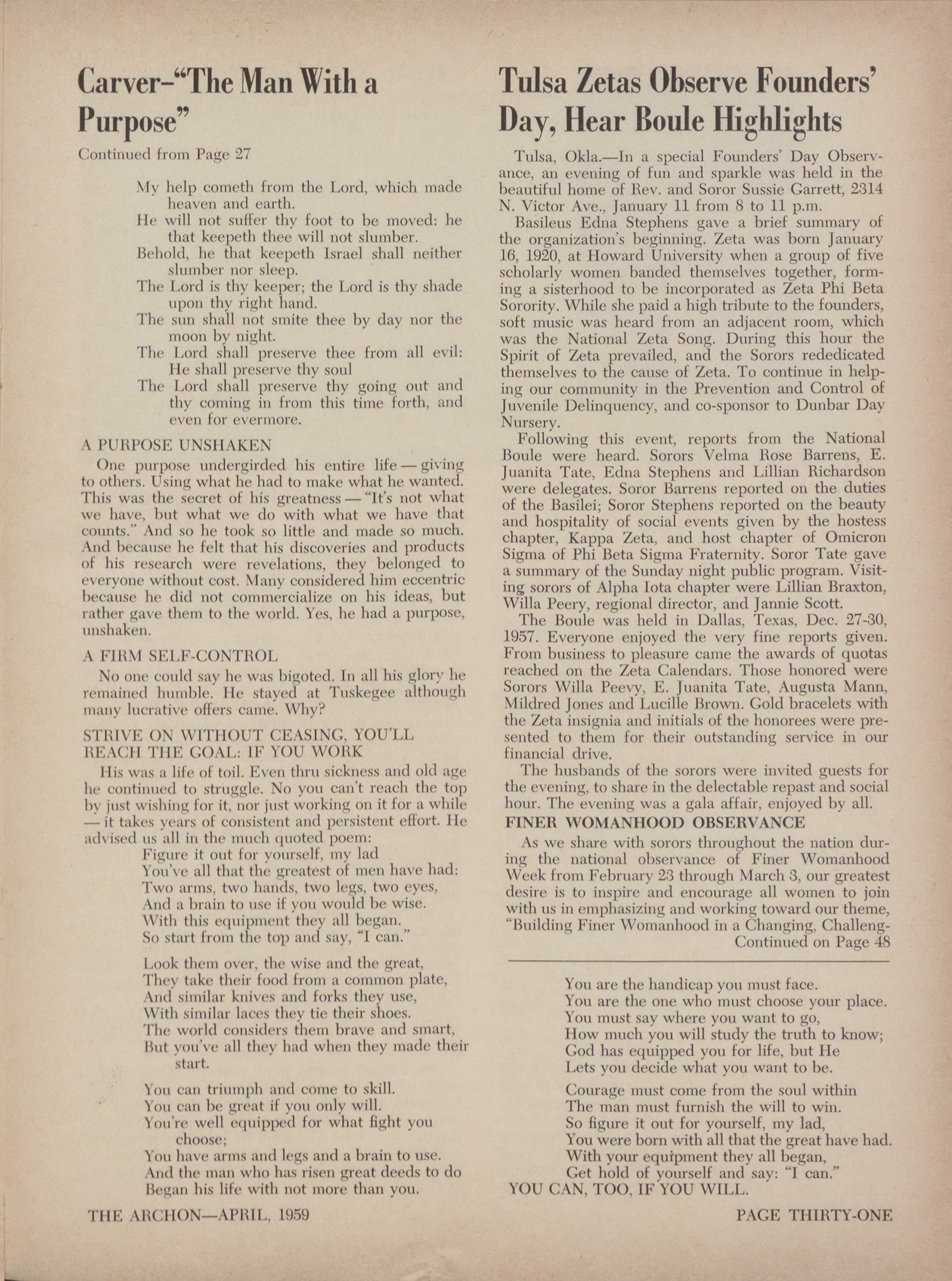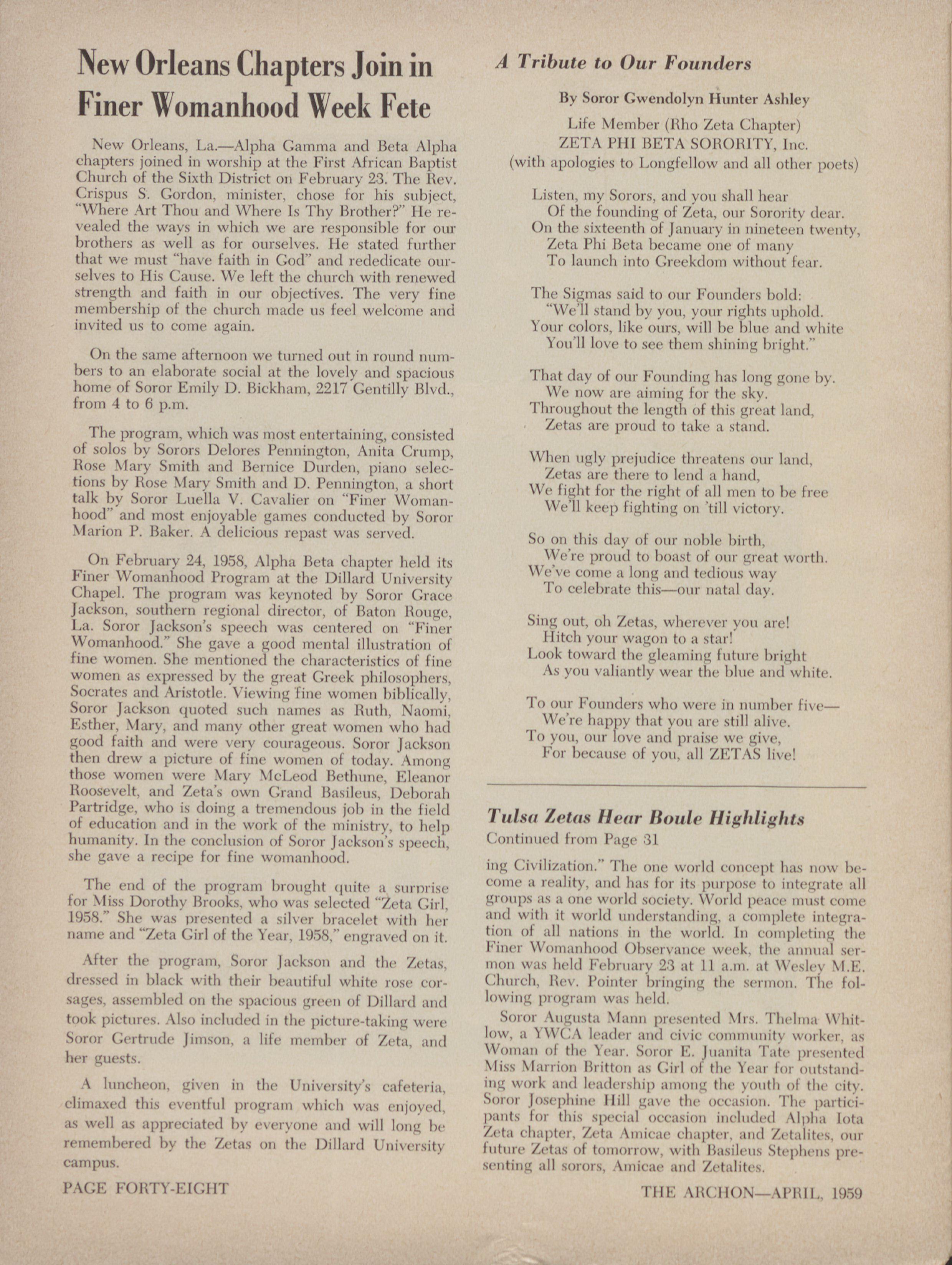 For 1,(·catise of you, all ZE.TAS live! then drew a picture of fi,ic· wome~ of today. Among those women were Mary \Ic[,rod Bethune, Eleanor llc)(>Sevilt, alid Zetit's own (i-31)(1 14.i.Ni|cils, 1 )(,1)(,1'1111 Partridge, who is doil Ig a ti-cilic·,id-s job iii the fick' 7'uiNfi Zetas Ilecir Boule Highlights of education and in the work of the mii,istry, to hclp humanity. In the conchision of Soror Jackson's speech, Continued from Page .31 she gave a recipe for fine womanhood.