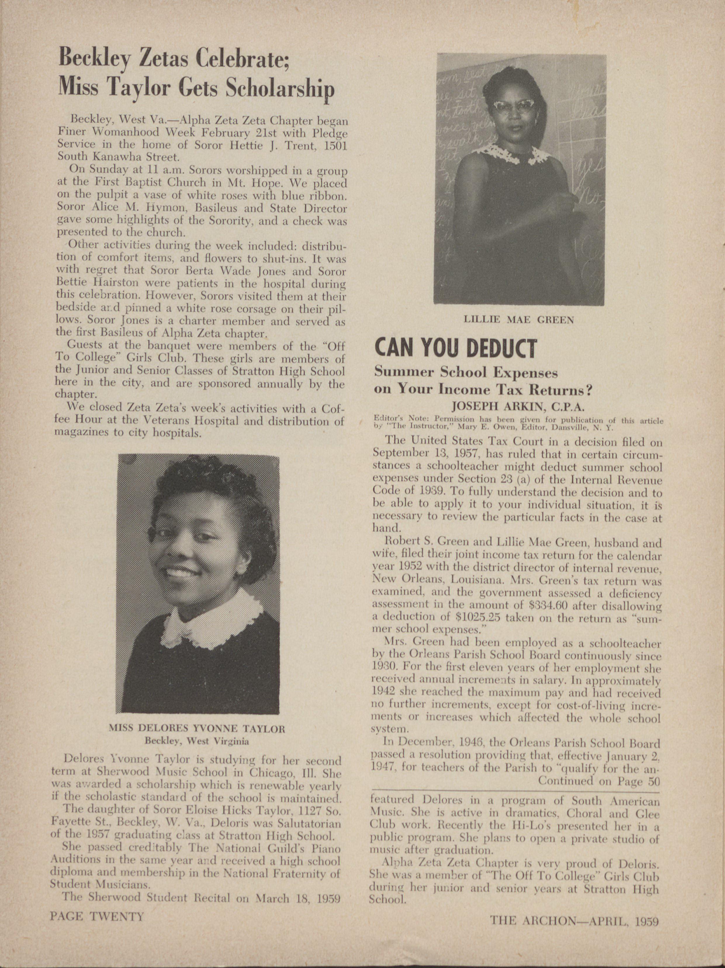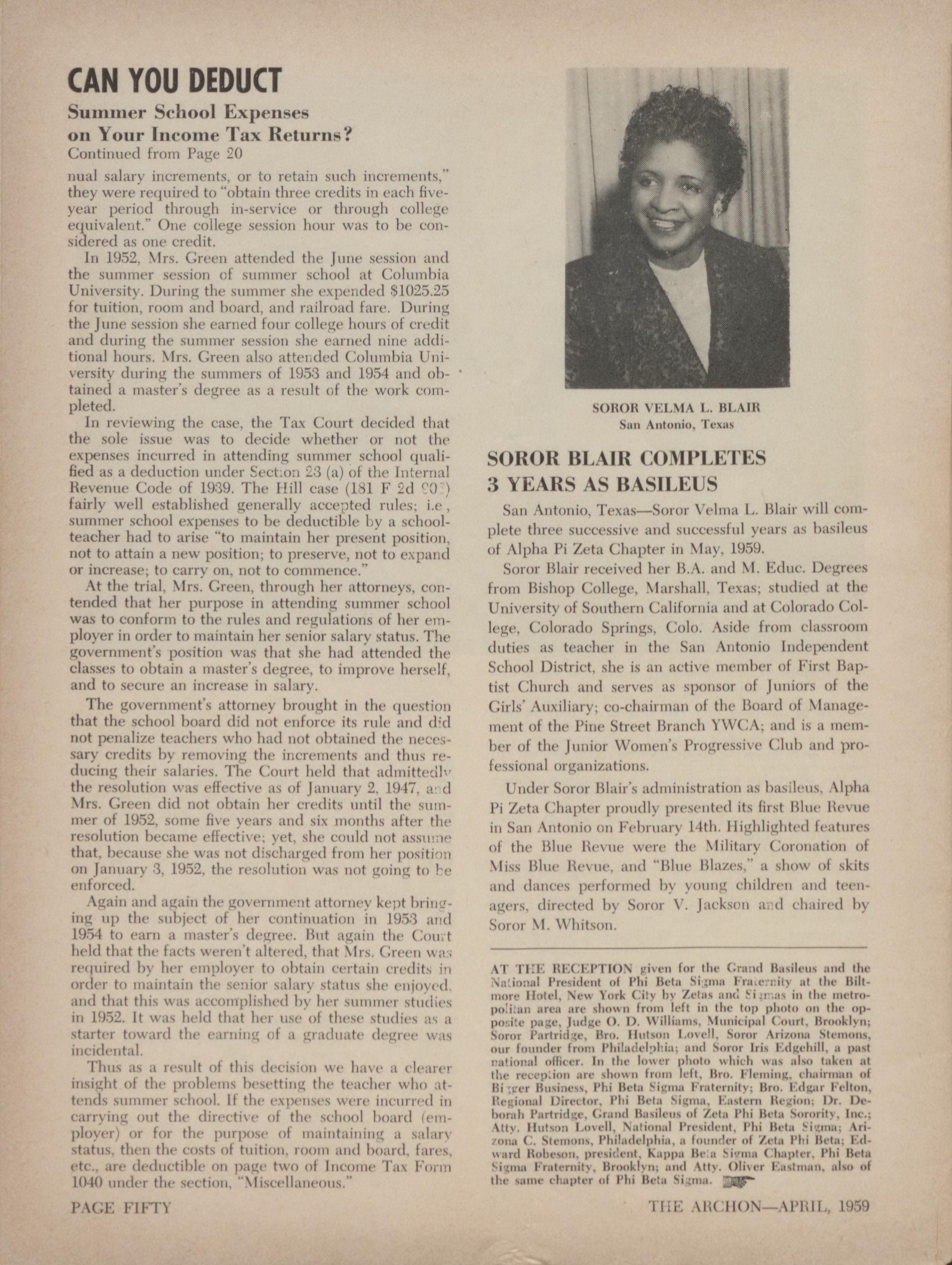 fairly wcH established generally accepted niles; Le, San Autonio, Texas-Soror Vehna L. Blair will coinsummer school expenses to be deductible hy £ School- plete three successive and sliccess],il >rars as litisilens teacher had to arise "to maintain her presciIt position, not to attain a new position; to preserve, not to expillic| of Ali,ha Pi Zeta Chapter iii May, 1959. or increase; to carry on, not to commence."